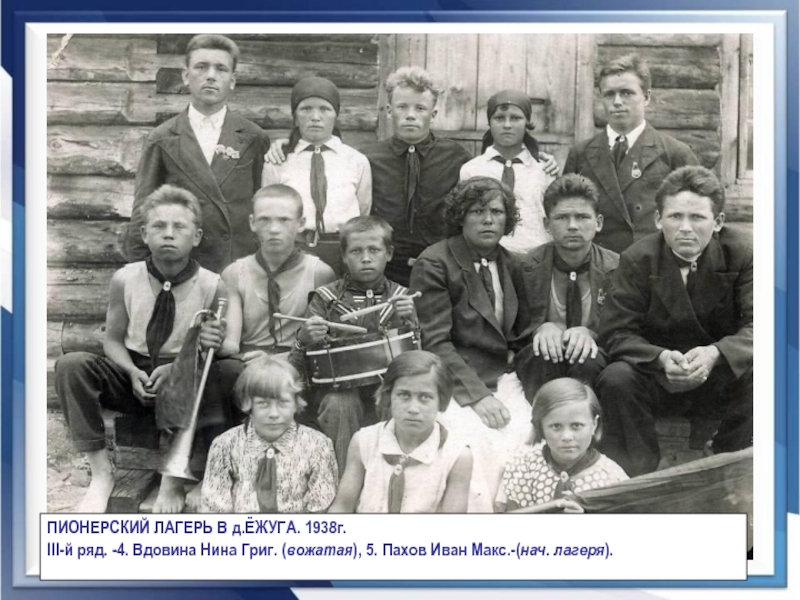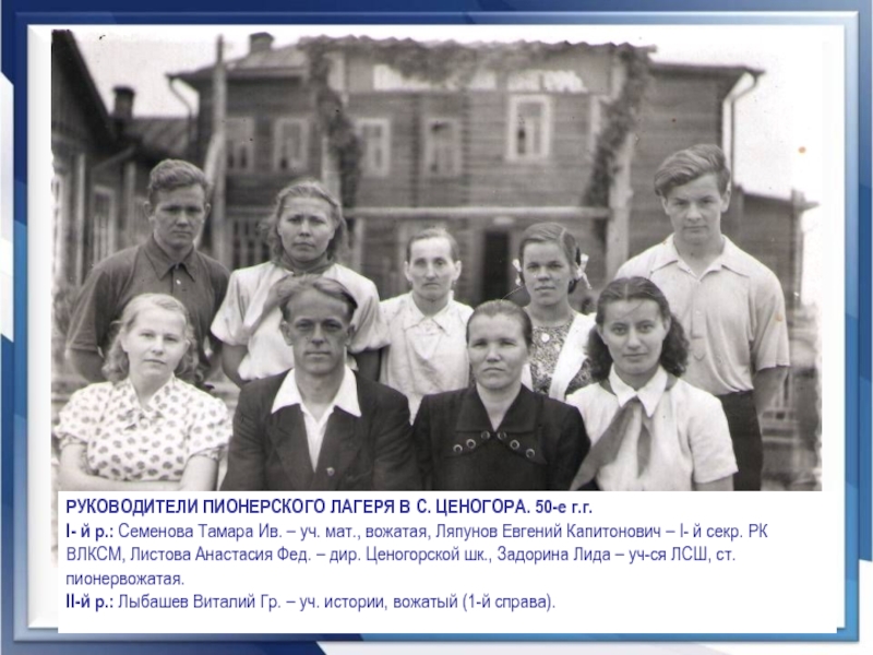I- й р.: Семенова Тамара Ив. – уч. мат., вожатая, Ляпунов Евгений Капитонович – I- й секр. РК ВЛКСМ, Листова Анастасия Фед. – дир. Ценогорской шк., Задорина Лида – уч-ся ЛСШ, ст. пионервожатая.