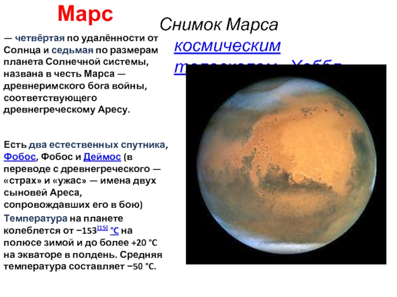 и седьмая по размерам планета Солнечной системы, названа в честь Марса — древнеримского бога войны, соответствующего древнегреческому Аресу.