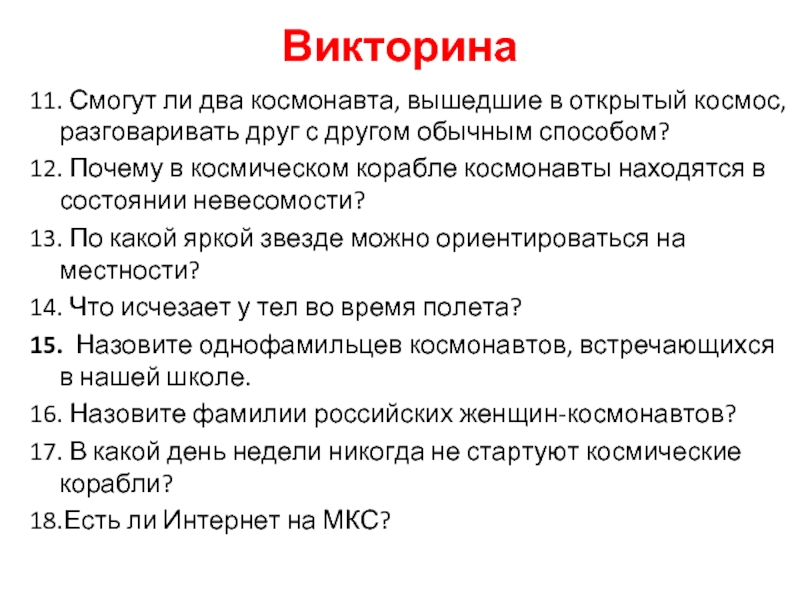 11. Смогут ли два космонавта, вышедшие в открытый космос, разговаривать друг