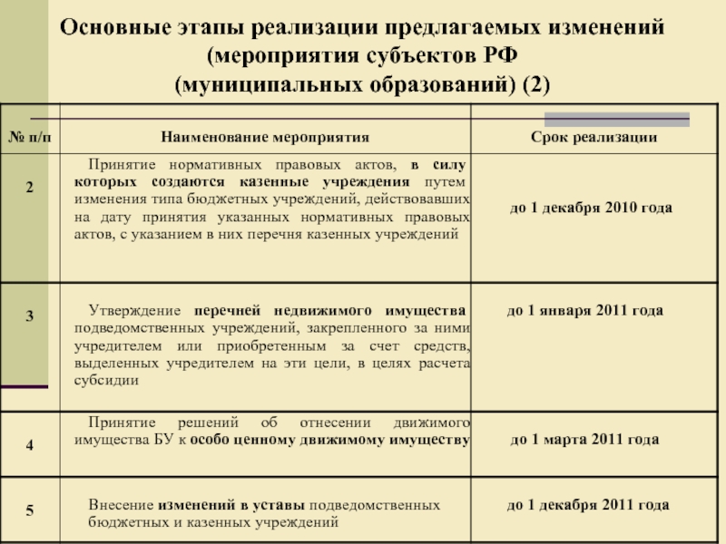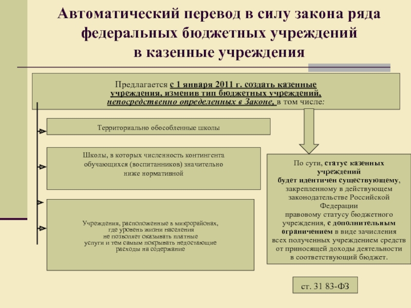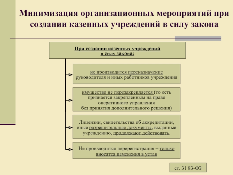 2)Перевод остальных бюджетных учреждений в казенные учреждения с минимальными правами по распоряжению доходами и имуществом