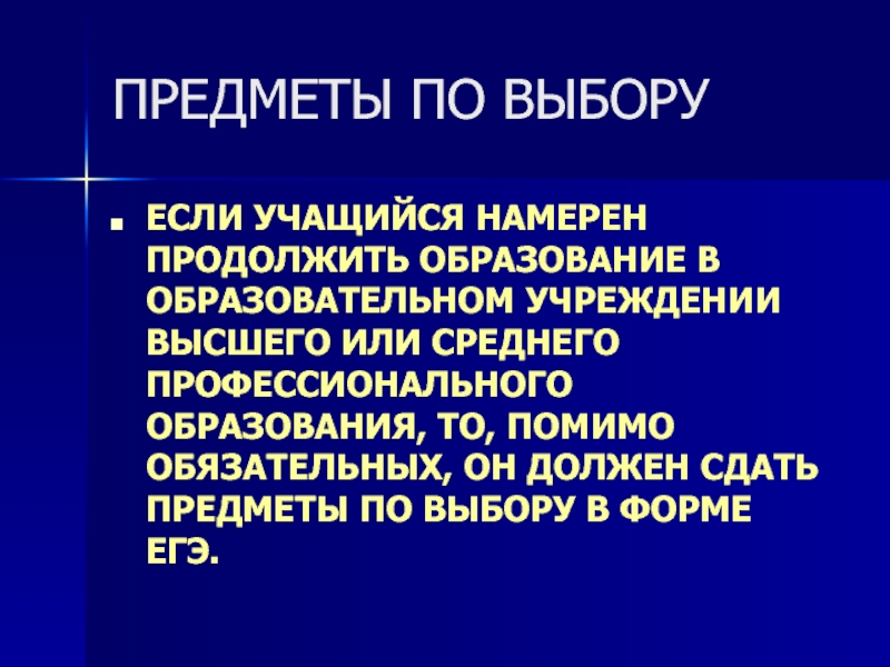 ВЫСШЕГО ИЛИ СРЕДНЕГО ПРОФЕССИОНАЛЬНОГО ОБРАЗОВАНИЯ, ТО, ПОМИМО ОБЯЗАТЕЛЬНЫХ, ОН ДОЛЖЕН СДАТЬ ПРЕДМЕТЫ ПО ВЫБОРУ В ФОРМЕ ЕГЭ.