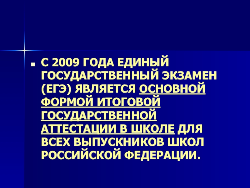 Слайд 2С 2009 ГОДА ЕДИНЫЙ ГОСУДАРСТВЕННЫЙ ЭКЗАМЕН (ЕГЭ) ЯВЛЯЕТСЯ ОСНОВНОЙ ФОРМОЙ ИТОГОВОЙ