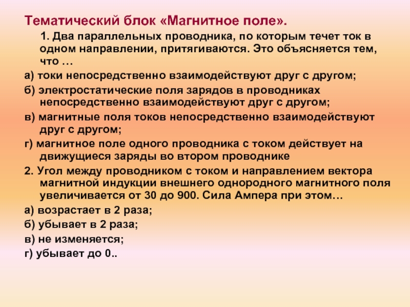 2. Угол между проводником с током и направлением вектора магнитной индукции внешнего однородного магнитного поля увеличивается от 30 до 900. Сила Ампера при этом…