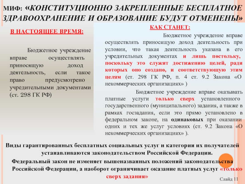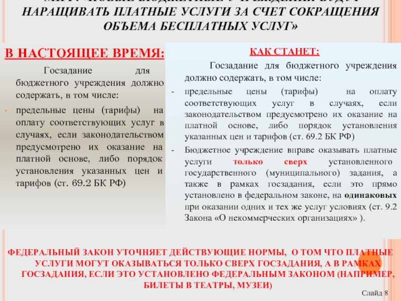 ФЕДЕРАЛЬНЫЙ ЗАКОН УТОЧНЯЕТ ДЕЙСТВУЮЩИЕ НОРМЫ, О ТОМ ЧТО ПЛАТНЫЕ УСЛУГИ МОГУТ ОКАЗЫВАТЬСЯ ТОЛЬКО СВЕРХ ГОСЗАДАНИЯ, А В РАМКАХ ГОСЗАДАНИЯ, ЕСЛИ ЭТО УСТАНОВЛЕНО ФЕДЕРАЛЬНЫМ ЗАКОНОМ (НАПРИМЕР, БИЛЕТЫ В ТЕАТРЫ, МУЗЕИ)