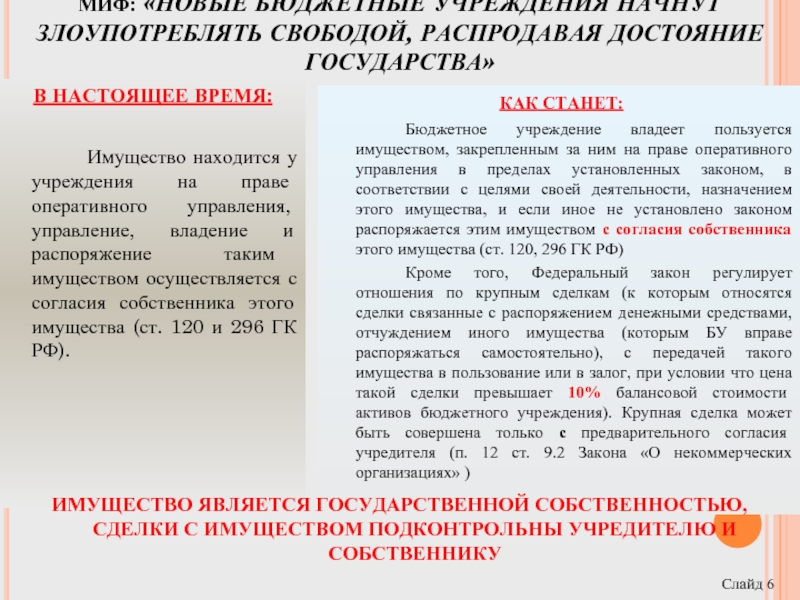 Кроме того, Федеральный закон регулирует отношения по крупным сделкам (к которым относятся сделки связанные с распоряжением денежными средствами, отчуждением иного имущества (которым БУ вправе распоряжаться самостоятельно), с передачей такого имущества в пользование или в залог, при условии что цена такой сделки превышает 10% балансовой стоимости активов бюджетного учреждения). Крупная сделка может быть совершена только с предварительного согласия учредителя (п. 12 ст. 9.2 Закона «О некоммерческих организациях» )