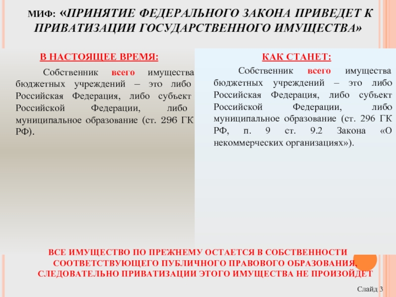 ВСЕ ИМУЩЕСТВО ПО ПРЕЖНЕМУ ОСТАЕТСЯ В СОБСТВЕННОСТИ СООТВЕТСТВУЮЩЕГО ПУБЛИЧНОГО ПРАВОВОГО ОБРАЗОВАНИЯ, СЛЕДОВАТЕЛЬНО ПРИВАТИЗАЦИИ ЭТОГО ИМУЩЕСТВА НЕ ПРОИЗОЙДЕТ