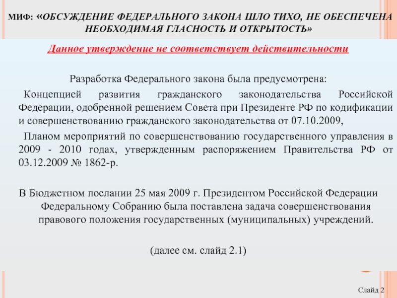 В Бюджетном послании 25 мая 2009 г. Президентом Российской Федерации Федеральному Собранию была поставлена задача совершенствования правового положения государственных (муниципальных) учреждений.
