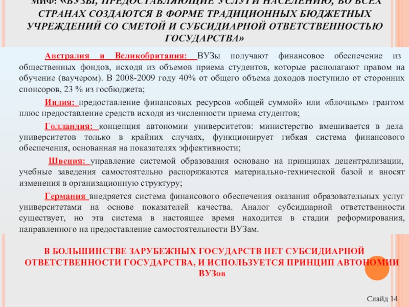 В БОЛЬШИНСТВЕ ЗАРУБЕЖНЫХ ГОСУДАРСТВ НЕТ СУБСИДИАРНОЙ ОТВЕТСТВЕННОСТИ ГОСУДАРСТВА, И ИСПОЛЬЗУЕТСЯ ПРИНЦИП АВТОНОМИИ ВУЗов