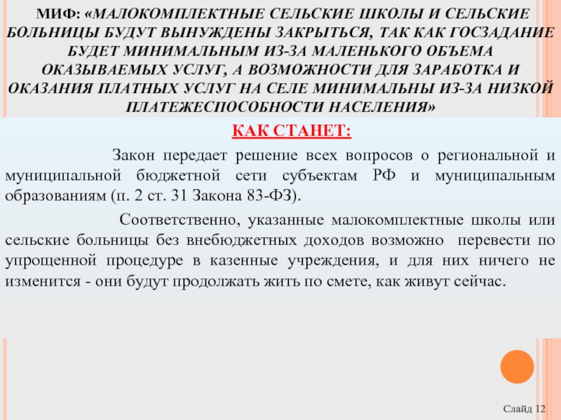 Соответственно, указанные малокомплектные школы или сельские больницы без внебюджетных доходов возможно перевести по упрощенной процедуре в казенные учреждения, и для них ничего не изменится - они будут продолжать жить по смете, как живут сейчас.