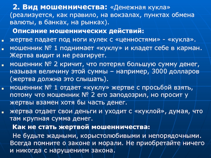 Слайд 10 2. Вид мошенничества: «Денежная кукла» (реализуется, как правило, на вокзалах, пунктах
