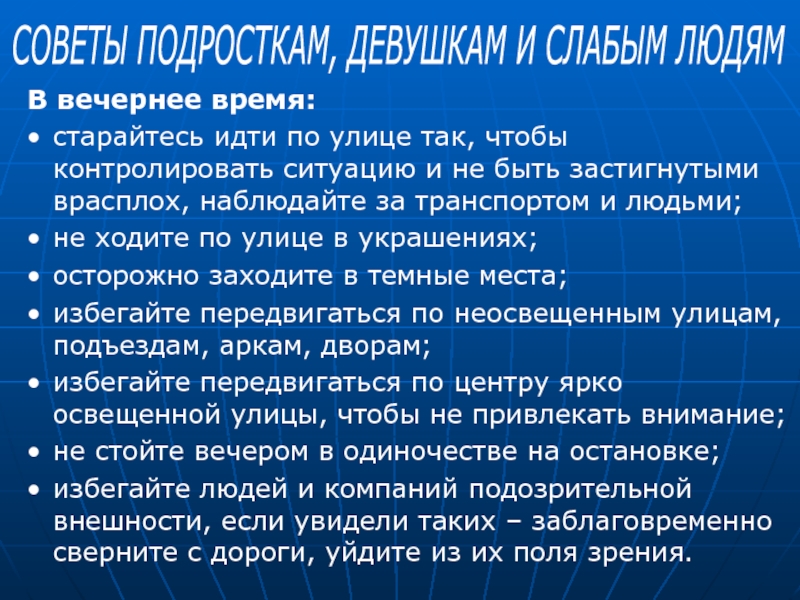 Слайд 5СОВЕТЫ ПОДРОСТКАМ, ДЕВУШКАМ И СЛАБЫМ ЛЮДЯМ