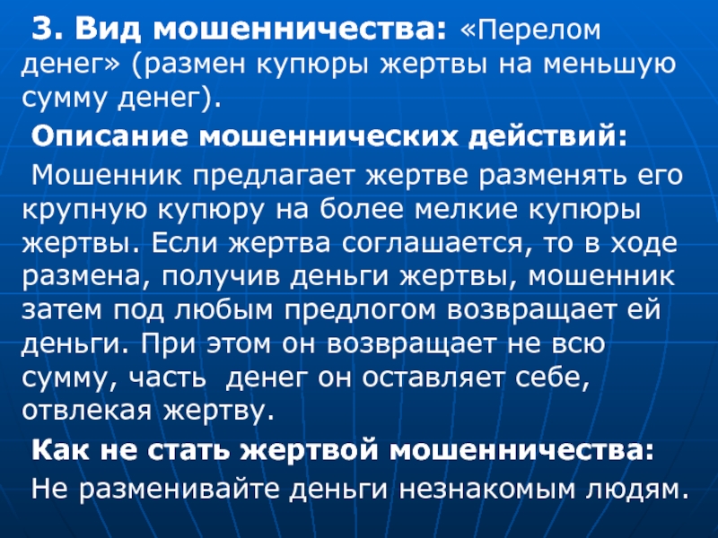 Слайд 11 3. Вид мошенничества: «Перелом денег» (размен купюры жертвы на меньшую сумму