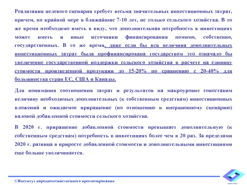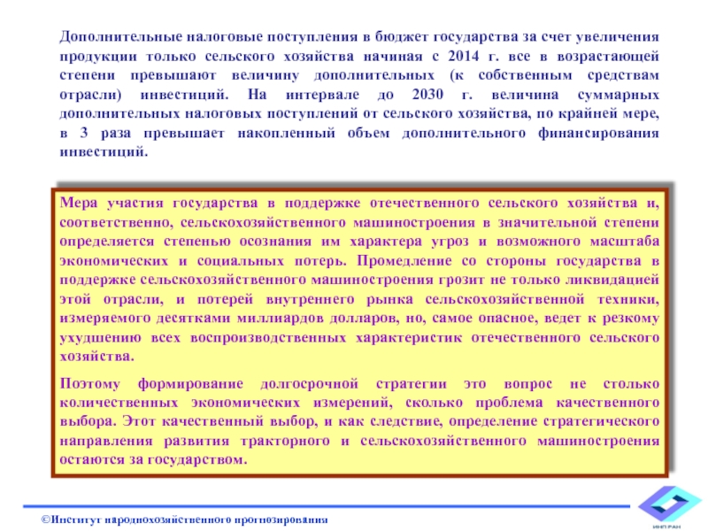Дополнительные налоговые поступления в бюджет государства за счет увеличения продукции только сельского хозяйства начиная с 2014 г. все в возрастающей степени превышают величину дополнительных (к собственным средствам отрасли) инвестиций. На интервале до 2030 г. величина суммарных дополнительных налоговых поступлений от сельского хозяйства, по крайней мере, в 3 раза превышает накопленный объем дополнительного финансирования инвестиций.