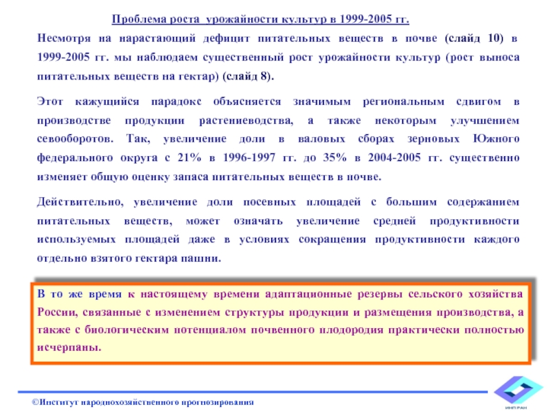 В то же время к настоящему времени адаптационные резервы сельского хозяйства России, связанные с изменением структуры продукции и размещения производства, а также с биологическим потенциалом почвенного плодородия практически полностью исчерпаны.