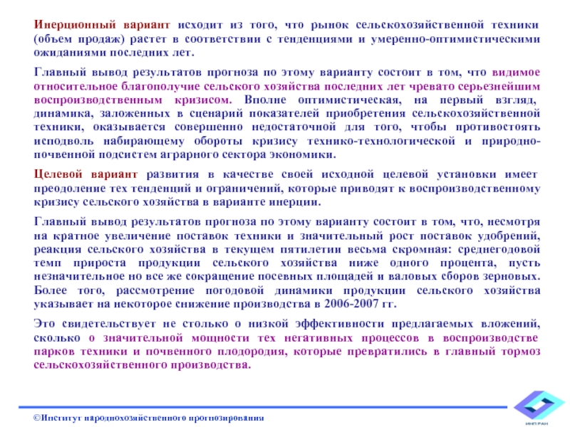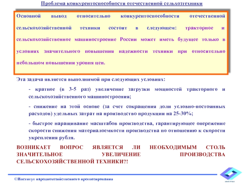 По тем же самым причинам, не существует какой-либо «проблемы горба» применительно к динамике производства сельскохозяйственной техники: – нет оснований опасаться, что, увеличив производство тракторов и комбайнов в короткие сроки даже в 4-5 раз, мы вдруг столкнемся с проблемой отсутствия спроса. В данном случае речь, естественно, идет о технологическом, а не о платежеспособном спросе.