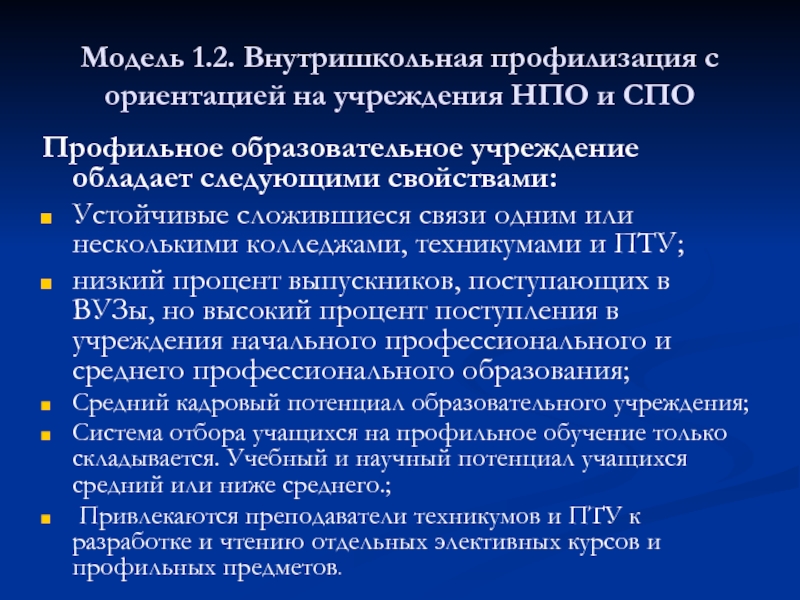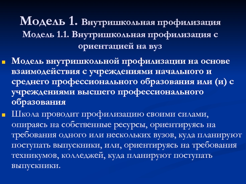 Модель внутришкольной профилизации на основе взаимодействия с учреждениями начального и среднего профессионального образования или (и) с учреждениями высшего профессионального образования