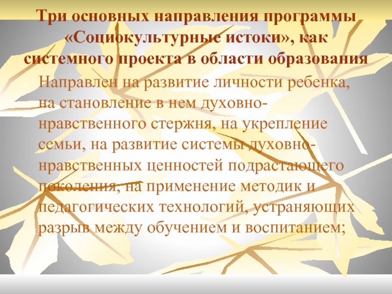 Слайд 9Три основных направления программы «Социокультурные истоки», как системного проекта в области