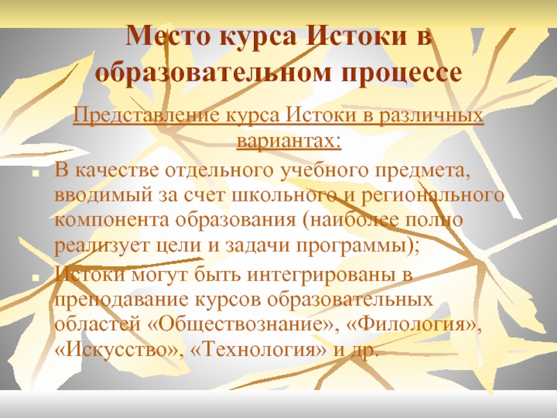 Истоки могут быть интегрированы в преподавание курсов образовательных областей «Обществознание», «Филология», «Искусство», «Технология» и др.