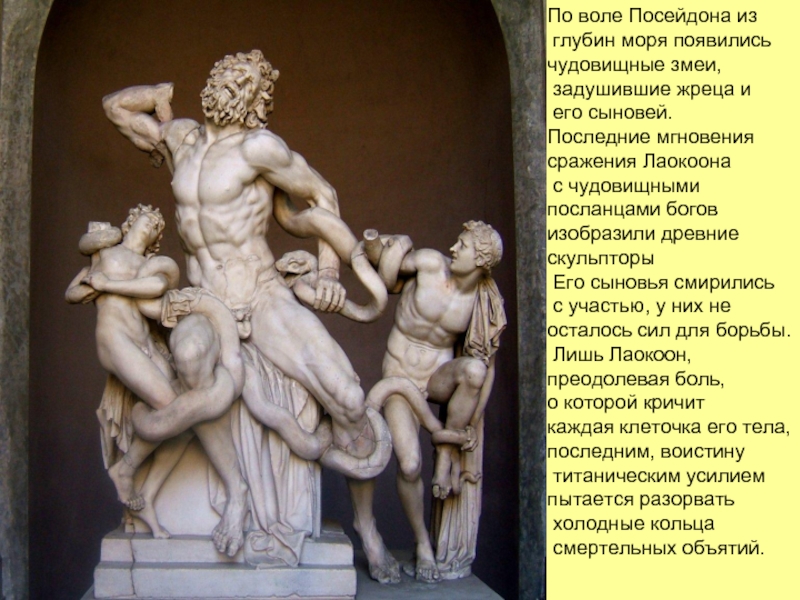 Лаокоон - жрец древней Трои. 10 лет шла осада города, 10 лет греческие воины не могли сломить сопротивление его защитников. Но хитроумный Одиссей, царь острова Итака, придумал знаменитый трюк с конем, решившим участь города. Лаокоон пытался остановить своих соотечественников, но боги, принявшие сторону ахейцев наказали его.