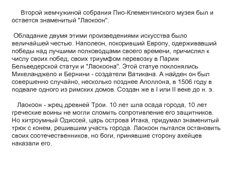 Обладание двумя этими произведениями искусства было величайшей честью. Наполеон, покоривший Европу, одерживавший победы над лучшими полководцами своего времени, причислял к числу своих побед, своих триумфом перевозку в Париж Бельведерской статуи и "Лаокоона". Этой статуе поклонялись Микеланджело и Бернини - создатели Ватикана. А найден он был совершенно случайно, несколько позднее Аполлона, в 1506 году в подвале одного из римских домов. Создан же в I или II веке до н. э.