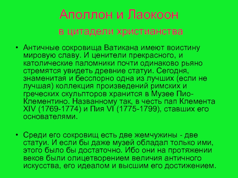 коллекции Ватикана является "Аполлон Бельведерский". Прекрасный и вечно