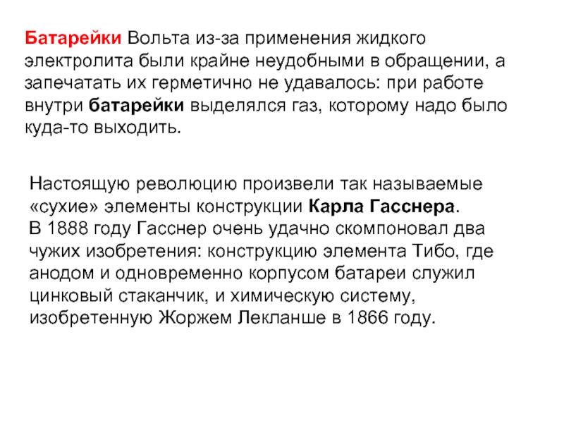 Настоящую революцию произвели так называемые «сухие» элементы конструкции Карла Гасснера.
