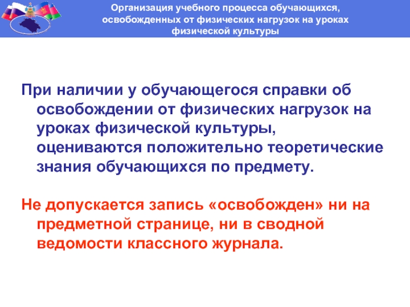 При наличии у обучающегося справки об освобождении от физических нагрузок на уроках физической культуры, оцениваются положительно теоретические знания обучающихся по предмету.
