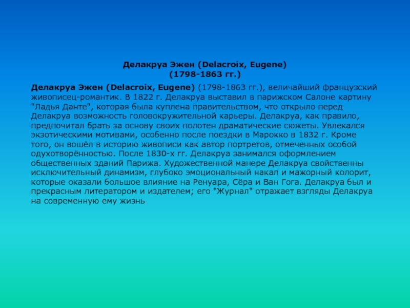 французский живописец-романтик. В 1822 г. Делакруа выставил в парижском Салоне картину "Ладья Данте", которая была куплена правительством, что открыло перед Делакруа возможность головокружительной карьеры. Делакруа, как правило, предпочитал брать за основу своих полотен драматические сюжеты. Увлекался экзотическими мотивами, особенно после поездки в Марокко в 1832 г. Кроме того, он вошёл в историю живописи как автор портретов, отмеченных особой одухотворённостью. После 1830-х гг. Делакруа занимался оформлением общественных зданий Парижа. Художественной манере Делакруа свойственны исключительный динамизм, глубоко эмоциональный накал и мажорный колорит, которые оказали большое влияние на Ренуара, Сёра и Ван Гога. Делакруа был и прекрасным литератором и издателем; его "Журнал" отражает взгляды Делакруа на современную ему жизнь.