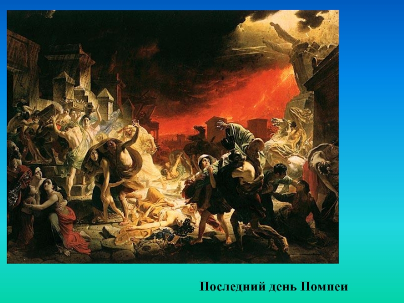 В 1823-1834 гг. Брюллов жил в Италии, создал ряд жанровых картин ("Итальянское утро", "Итальянский полдень"), в которых решал проблемы осветления, показывал взаимосвязь человека с природой. Черты романтизма имеют автопортрет, портреты Брюллова, Г.Гагарина и одна из лучших работ - "Всадница". Широко известно полотно "Последний день Помпеи" (1830-1833 гг., золотая медаль в Париже). Трагическая гибель людей во время извержения Везувия, поэтика чувств, величие человеческого духа перед слепой стихией иллюстрировали драматическое восприятие художником жизни.