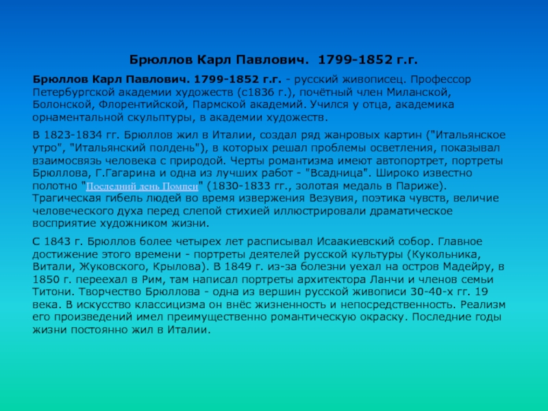 Слайд 8Брюллов Карл Павлович. 1799-1852 г.г.
