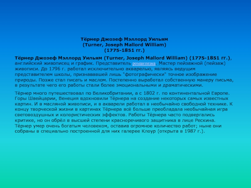 (Turner, Joseph Mallord William) (1775-1851 гг.), английский живописец и график. Представитель романтизма. Мастер пейзажной (пейзаж) живописи. До 1796 г. работал исключительно акварелью, являясь ведущим представителем школы, признававшей лишь "фотографически" точное изображение природы. Позже стал писать и маслом. Постепенно выработал собственную манеру письма, в результате чего его работы стали более эмоциональными и драматическими.