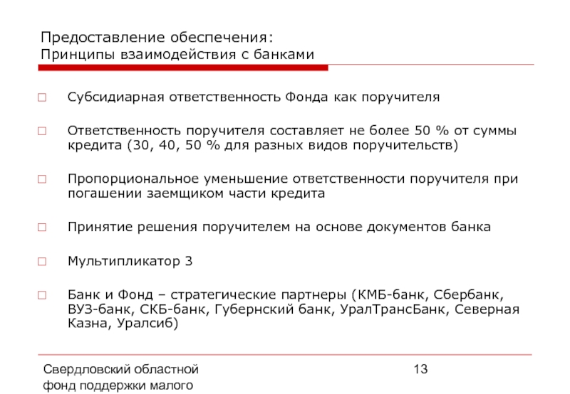 Банк и Фонд – стратегические партнеры (КМБ-банк, Сбербанк, ВУЗ-банк, СКБ-банк, Губернский банк, УралТрансБанк, Северная Казна, Уралсиб)