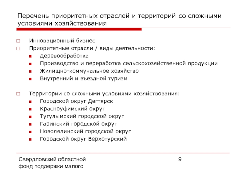 Целевая группа – субъекты малого предпринимательства, работающие в приоритетных отраслях или на территориях со сложными условиями хозяйствования