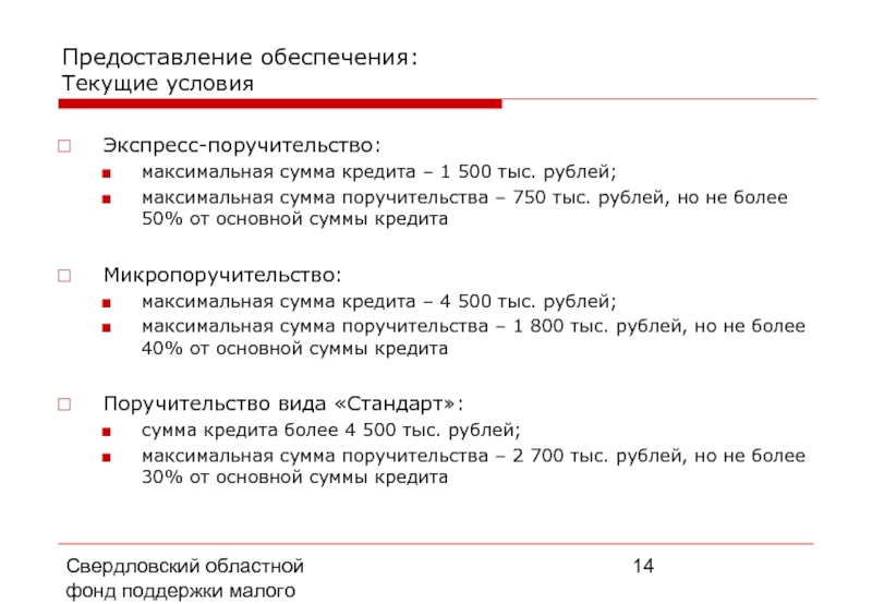 Увеличение максимальной суммы ответственности Фонда по поручительствам вида «Экспресс» с 300 до 750 тыс. рублей, «Микро» - с 600 до 1800 тыс. рублей, «Стандарт» - с 1350 до 2700 тыс. рублей