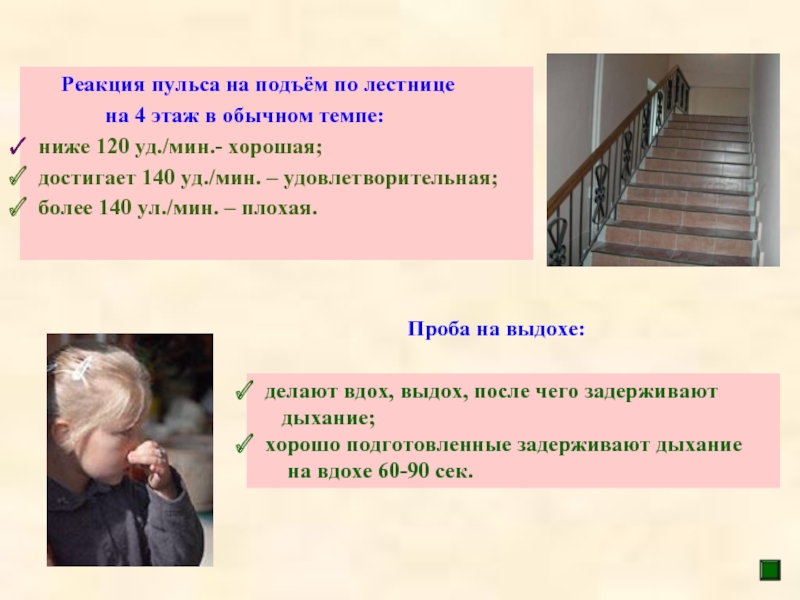 Критерии: длительность задержки дыхания тем выше, чем лучше физическая тренированность организма.