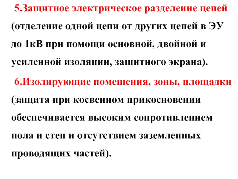6.Изолирующие помещения, зоны, площадки (защита при косвенном прикосновении обеспечивается высоким сопротивлением пола и стен и отсутствием заземленных проводящих частей).