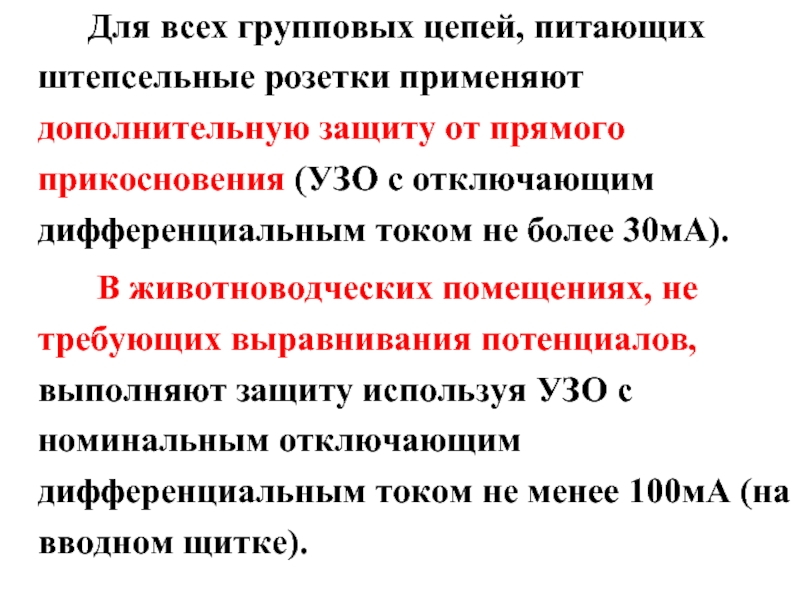 В животноводческих помещениях, не требующих выравнивания потенциалов, выполняют защиту используя УЗО с номинальным отключающим дифференциальным током не менее 100мА (на вводном щитке).