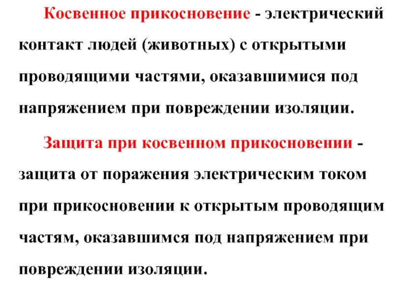 Слайд 8 Косвенное прикосновение - электрический контакт людей (животных) с открытыми проводящими частями,