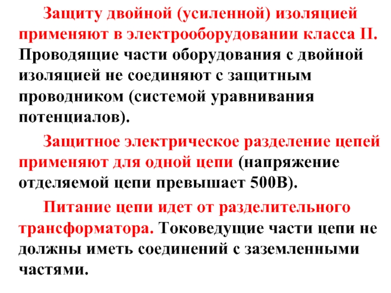 Слайд 22 Защиту двойной (усиленной) изоляцией применяют в электрооборудовании класса II. Проводящие части