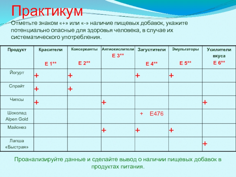 Проанализируйте данные и сделайте вывод о наличии пищевых добавок в продуктах питания.