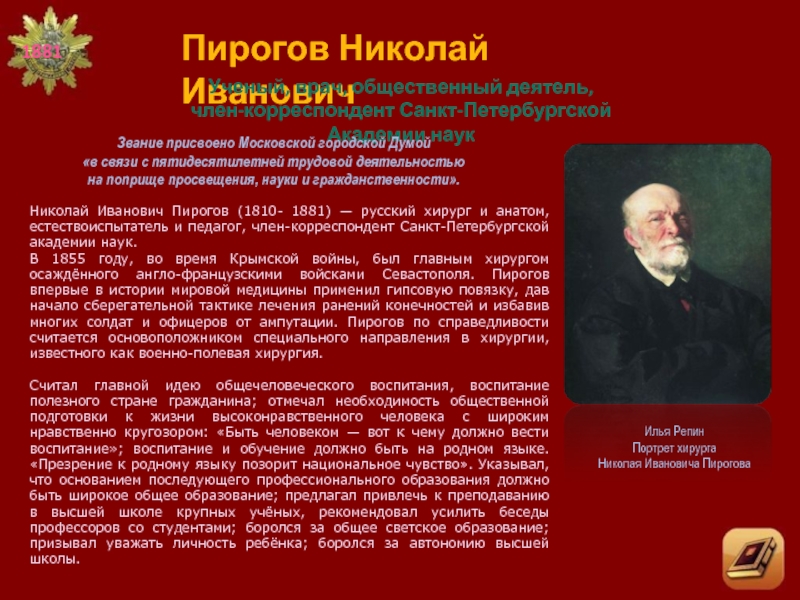 Николай Иванович Пирогов (1810- 1881) — русский хирург и анатом, естествоиспытатель и педагог, член-корреспондент Санкт-Петербургской академии наук.