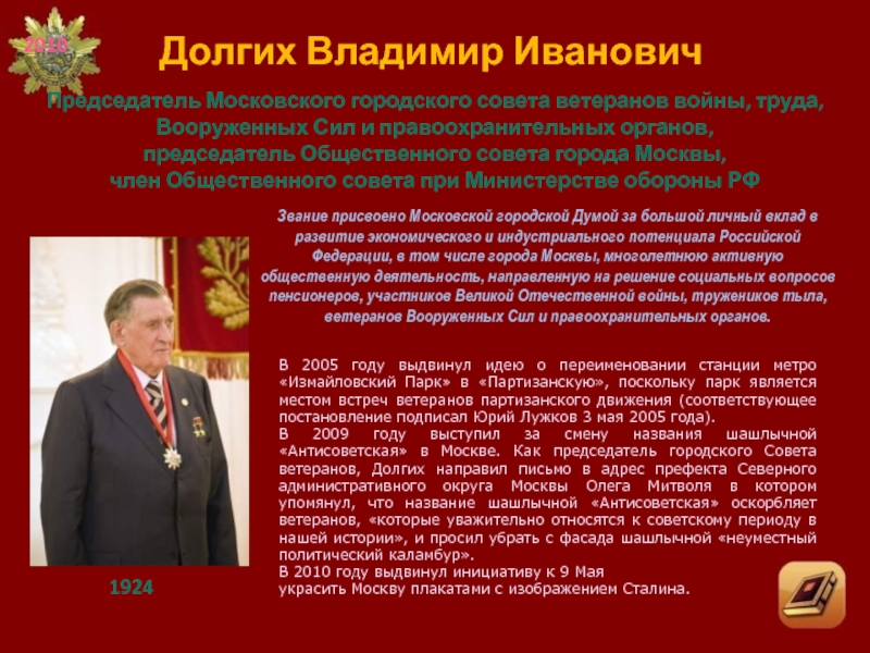 Председатель Московского городского совета ветеранов войны, труда, Вооруженных Сил и правоохранительных органов,