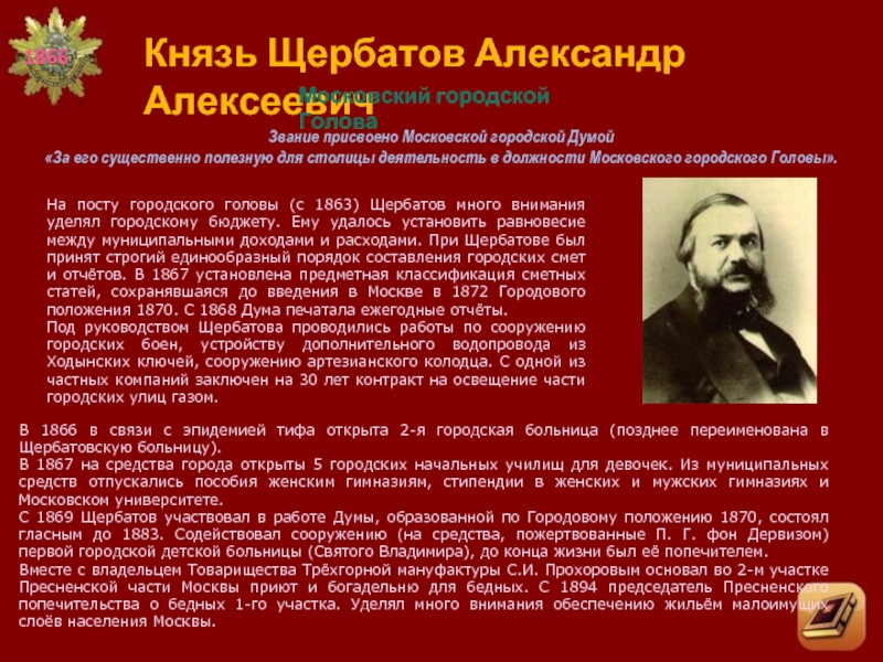 В 1866 в связи с эпидемией тифа открыта 2-я городская больница (позднее переименована в Щербатовскую больницу).