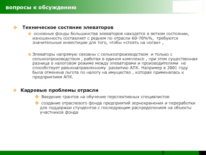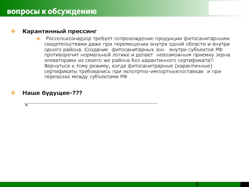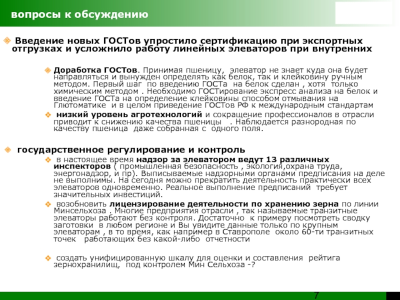 возобновить лицензирование деятельности по хранению зерна по линии Минсельхоза . Многие предприятия отрасли , так называемые транзитные элеваторы работают без контроля. Достаточно к примеру посмотреть сводку заготовки в любом регионе и Вы увидите данные только по крупным элеваторам , в то время, как например в Ставрополе около 60-ти транзитных точек  работающих без какой-либо отчетности