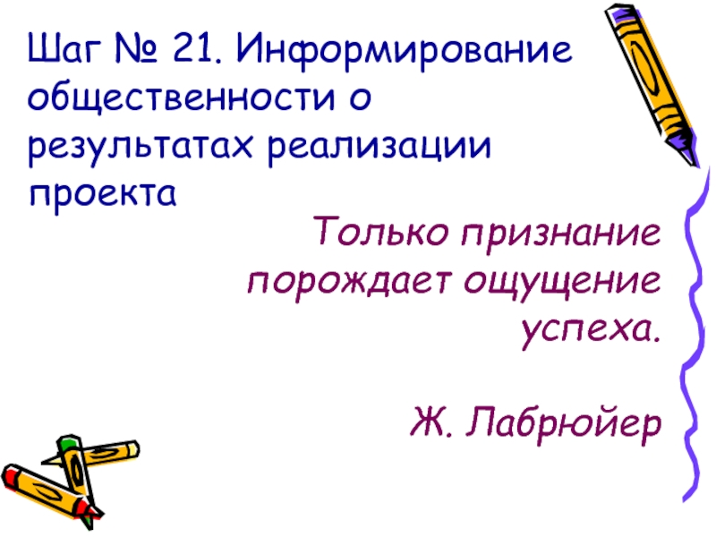 Слайд 51Шаг № 21. Информирование общественности о результатах реализации проекта