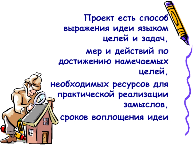 Слайд 6Проект есть способ выражения идеи языком целей и задач,
