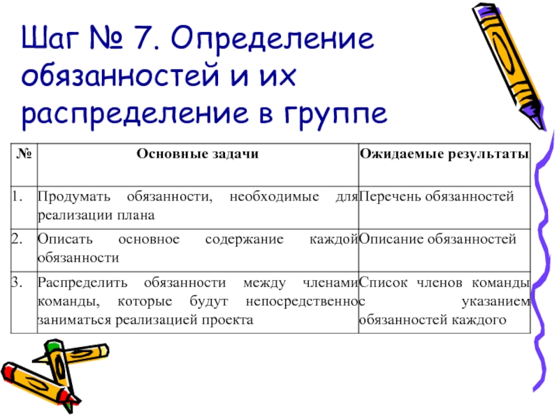 Слайд 29Шаг № 7. Определение обязанностей и их распределение в группе