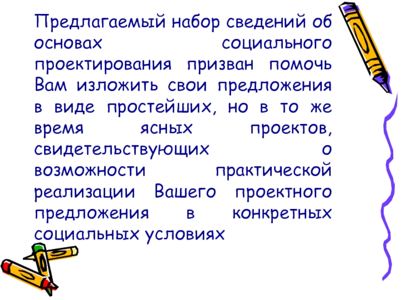 Слайд 2Предлагаемый набор сведений об основах социального проектирования призван помочь Вам изложить