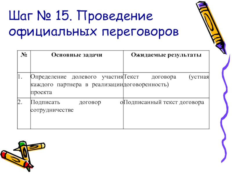 Слайд 44Шаг № 15. Проведение официальных переговоров