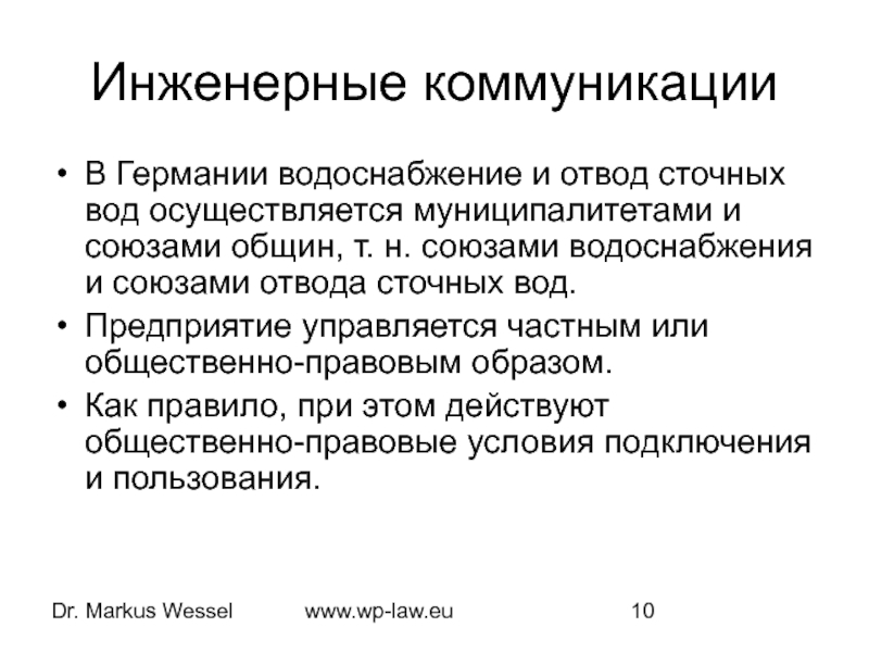 осуществляется муниципалитетами и союзами общин, т. н. союзами водоснабжения и союзами отвода сточных вод.
